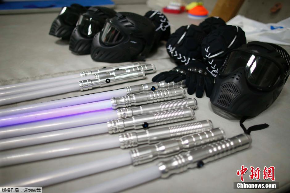 12月4日消息,法国巴黎,《星球大战7:原力觉醒》将于本月全球发布,同时光剑战斗也流行起来,于是三名《星球大战》粉丝合开了一家"Sport Saber League"学院,《星战》爱好者们可以练习光剑战斗,进行比赛。图为爱好者使用的光剑和护具。