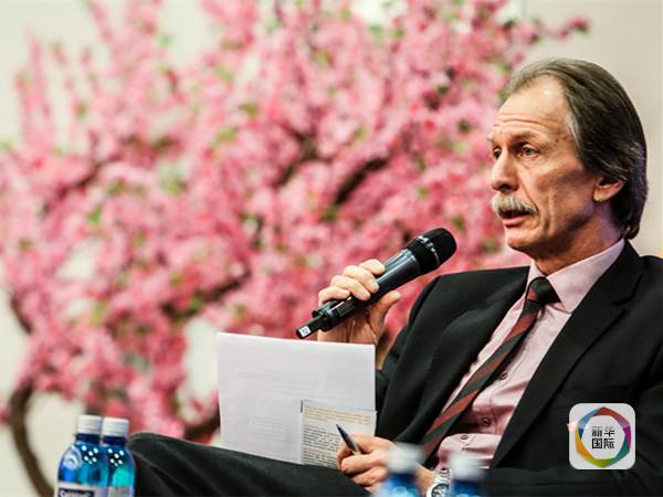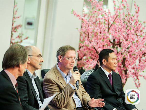 图为12月3日,在柏林中国驻德国使馆,卢森堡学者阿尔贝特·艾廷格(右二)在研讨会上发言。(新华社记者张帆摄)