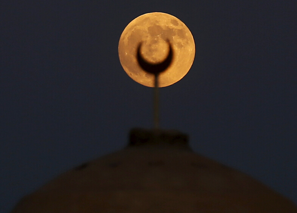 2015年9月27日,埃及开罗西南部法尤姆省,今年最后一轮“超级月亮”从沙漠中的瓦迪瑞安湖(Wadi El-Rayan Lake)清真寺光塔上空升起。“超级月亮”又被称为“血月”。
