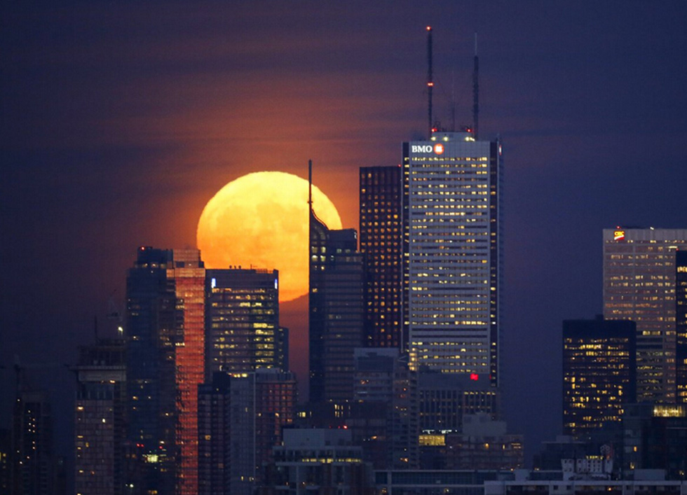 2015年11月25日,加拿大多伦多市,月亮从天际线和金融区后面升起。