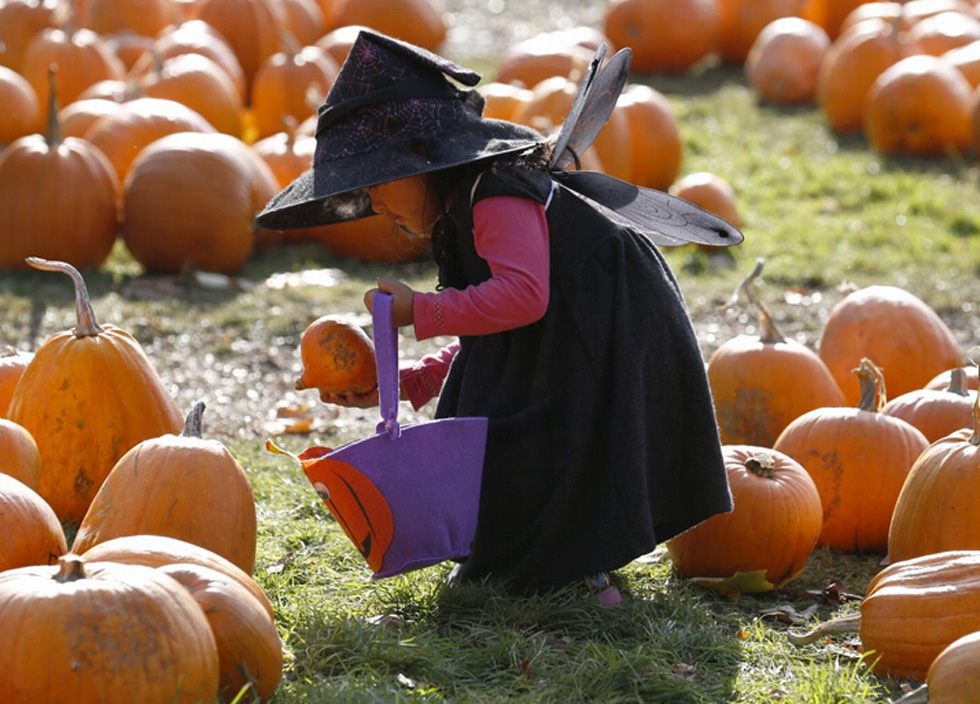 2015年10月26日,英国南部沃金(Woking)附近阿德利斯通(Addlestone),扮成女巫的的小女孩正在农场玩南瓜。