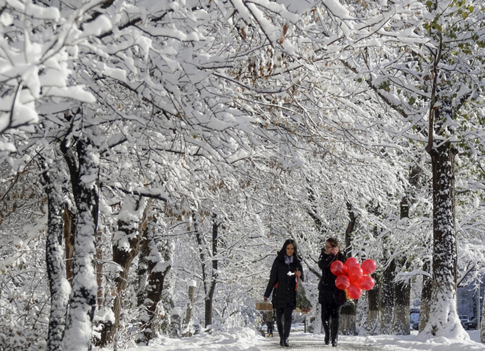 2015年11月16日,哈萨克斯坦阿拉木图(Almaty),这些女子沿着积雪覆盖的小路行走。