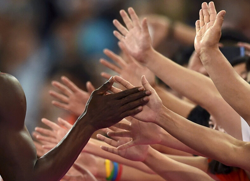 2015年8月27日,中国国家体育场举行第15届世界田径锦标赛,牙买加飞人博尔特(Usain Bolt)赢得男子200米短跑决赛后,与粉丝握手庆祝。