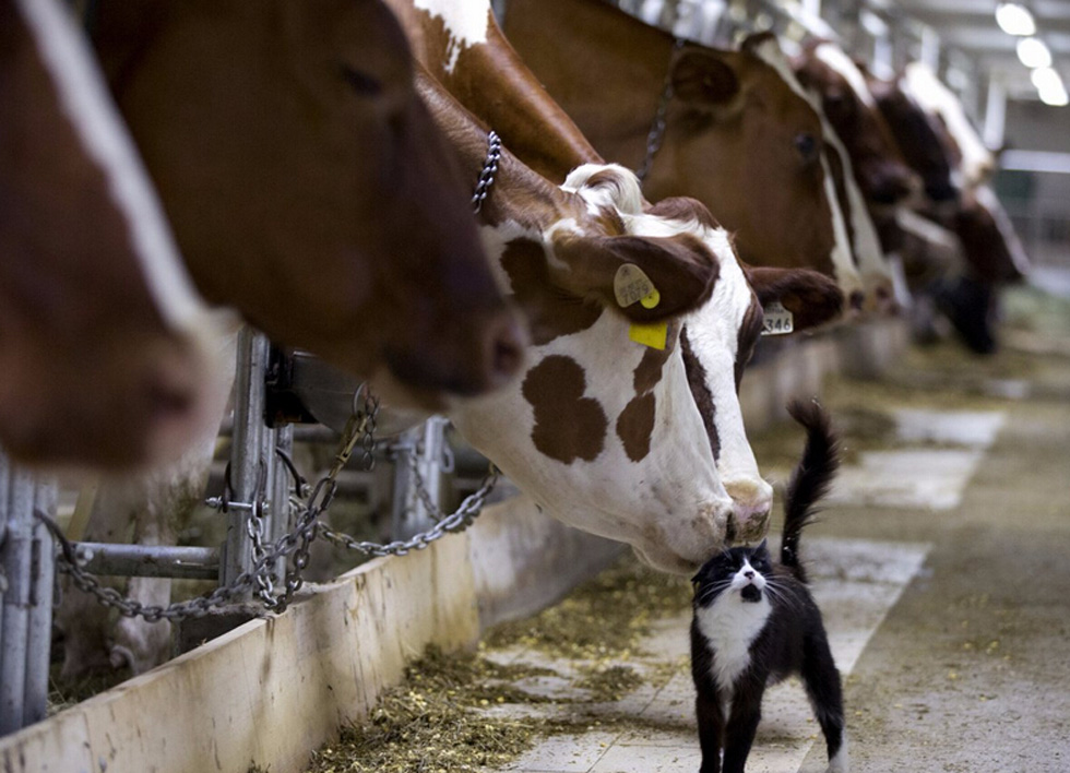 2015年7月26日,加拿大魁北克省格兰比(Granby)农场,等待挤奶的奶牛正轻嗅小猫。