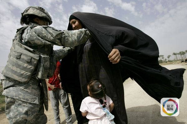 2008年5月8日,一名美军女兵在伊拉克对当地妇女搜身。(图片来源:新华/法新)