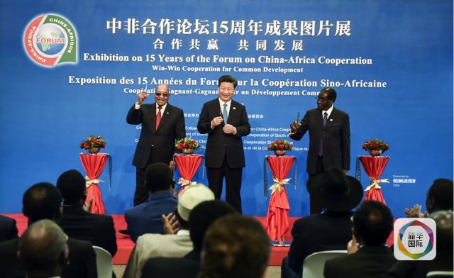 12月4日,国家主席习近平在约翰内斯堡出席中非合作论坛15周年成果图片展开幕式,同南非总统祖马,非盟轮值主席、津巴布韦总统穆加贝一道为展览剪彩。这是习近平同非洲国家和地区组织领导人观看展览。(新华社记者谢环驰摄)