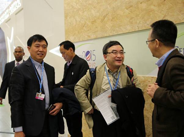 在巴黎气候大会会场中国角,中国谈判代表团代表邹骥在与参会者交谈。