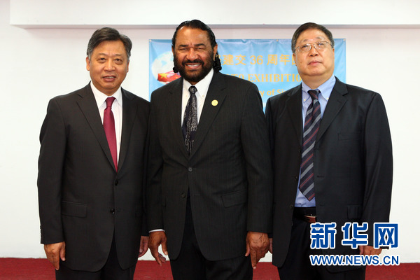 美国国会议员格林(中)与李强民总领事及主办方合影。由新华社休斯敦分社主办,中国驻休斯敦总领馆、休斯敦中国人活动中心、美国梁氏交流基金会等协办的中美建交36周年图片展当天在休斯敦中国人活动中心举行,展出的30幅由新华社记者拍摄的照片,展现了中美两国领导人互访交流的历史进程,其中包括习近平主席今年9月份访美的照片,受到了中国驻休斯敦总领事李强民、美国国会议员艾尔·格林、国会议员希拉·杰克逊·李的代表、美国亚洲协会得分分会会长福斯特、赖斯大学校长大卫·李伯隆、得克萨斯州华裔议员吴元之的代表、华人社团侨领及留学生代表等约百名嘉宾的欢迎。老布什总统私人代表尼尔.布什及二战飞虎队司令陈纳德将军外孙女凯乐威也发来贺信表示祝贺。新华社发(贾忠摄)