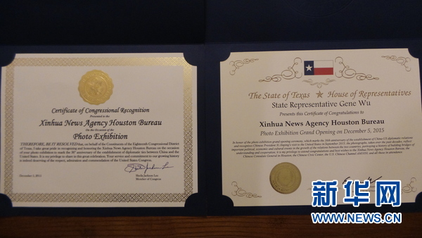 美国国会议员和得州议员颁发给主办方的图片展嘉奖令。由新华社休斯敦分社主办,中国驻休斯敦总领馆、休斯敦中国人活动中心、美国梁氏交流基金会等协办的中美建交36周年图片展当天在休斯敦中国人活动中心举行,展出的30幅由新华社记者拍摄的照片,展现了中美两国领导人互访交流的历史进程,其中包括习近平主席今年9月份访美的照片,受到了中国驻休斯敦总领事李强民、美国国会议员艾尔·格林、国会议员希拉·杰克逊·李的代表、美国亚洲协会得分分会会长福斯特、赖斯大学校长大卫·李伯隆、得克萨斯州华裔议员吴元之的代表、华人社团侨领及留学生代表等约百名嘉宾的欢迎。老布什总统私人代表尼尔.布什及二战飞虎队司令陈纳德将军外孙女凯乐威也发来贺信表示祝贺。新华社发(贾忠摄)
