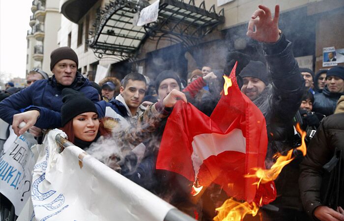 据俄罗斯国际文传电讯社报道,25日俄罗斯民众在土耳其驻俄使馆外就土耳其方面击落俄苏-24战机举行抗议活动。示威者向土耳其使馆投掷石块,鸡蛋,西红柿和油漆,并焚烧土耳其国旗。俄民众投掷的石头击中使馆二、三楼层的玻璃,落入使馆办公室内。