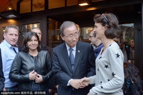 12月6日,潘基文访问法国巴黎遭袭咖啡馆和巴塔克兰剧院,喝咖啡,悼念遇难者。(图片来源:Sipa)