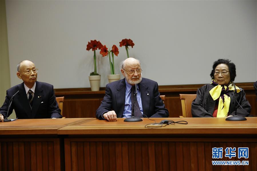 屠呦呦当天同另外两名生理学或医学奖得主爱尔兰科学家威廉·坎贝尔(下图中)和日本科学家大村智(下图左)共同出席了在瑞典卡罗琳医学院诺贝尔大厅举办的新闻发布会。屠呦呦佩戴亮黄色丝巾,活动主办方还特意为这位80多岁的中国诺奖得主提前准备了一壶贴心的热茶。