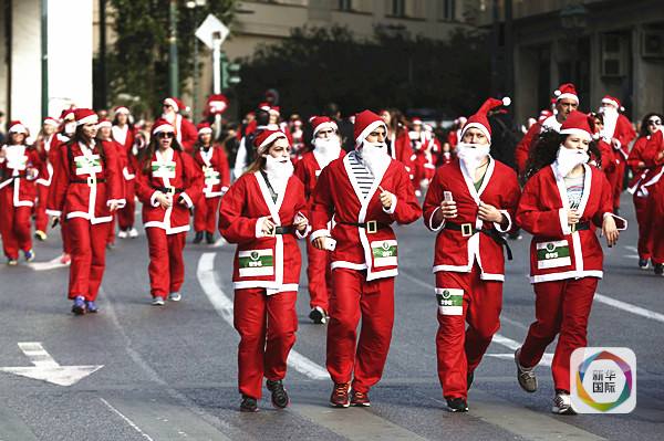 2015年11月29日,数百人打扮成圣诞老人的模样,参加在希腊雅典宪法广场举行的“圣诞老人跑”慈善筹款活动。(新华社/美联)