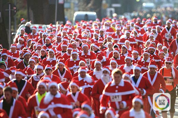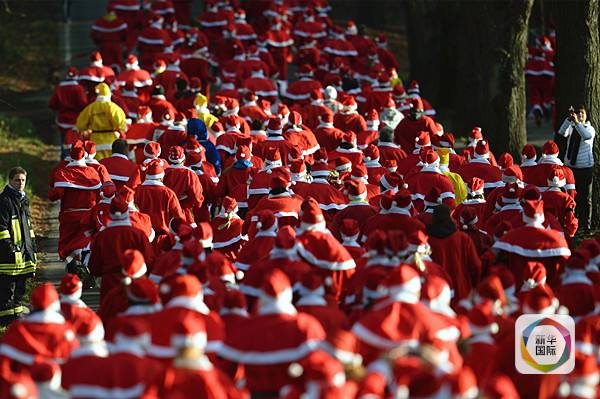 2015年12月6日,在德国米兴多夫,人们打扮成圣诞老人的样子参加圣尼古拉斯节的奔跑活动。(新华社/法新)