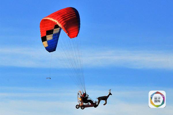 圣诞老人还会飞!这是2015年12月1日,在保加利亚布拉戈耶夫格勒,一名滑翔伞驾驶员身着圣诞老人服饰驾驶滑翔伞与他的“麋鹿”翱翔在天空。(新华社/欧新)