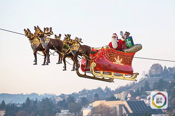 “飞行”的圣诞老人是瑞士蒙特勒圣诞市场为招揽游客而举行的一次特技表演,依靠架设在湖边和市场上空的一根钢缆完成。