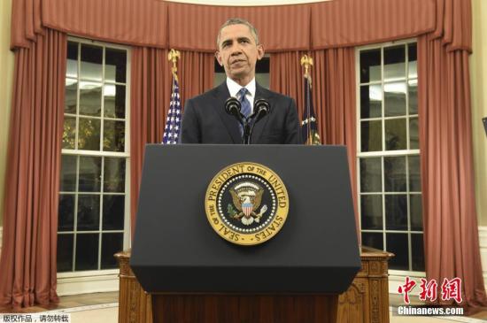 资料图:当地时间2015年12月6日,美国华盛顿,美国总统奥巴马于白宫椭圆办公室发布重要演说,对南加大规模枪击案发生后美国应对恐怖威胁以及如何打击极端组织做出说明。