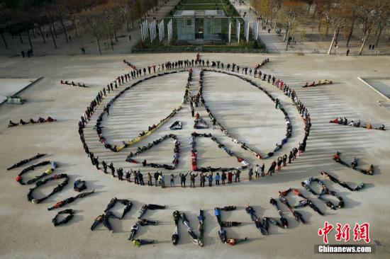当地时间2015年12月6日,法国巴黎,民众在埃菲尔铁塔附近,组成“为巴黎祈祷”的图形,以及“100%可再生”的标语。