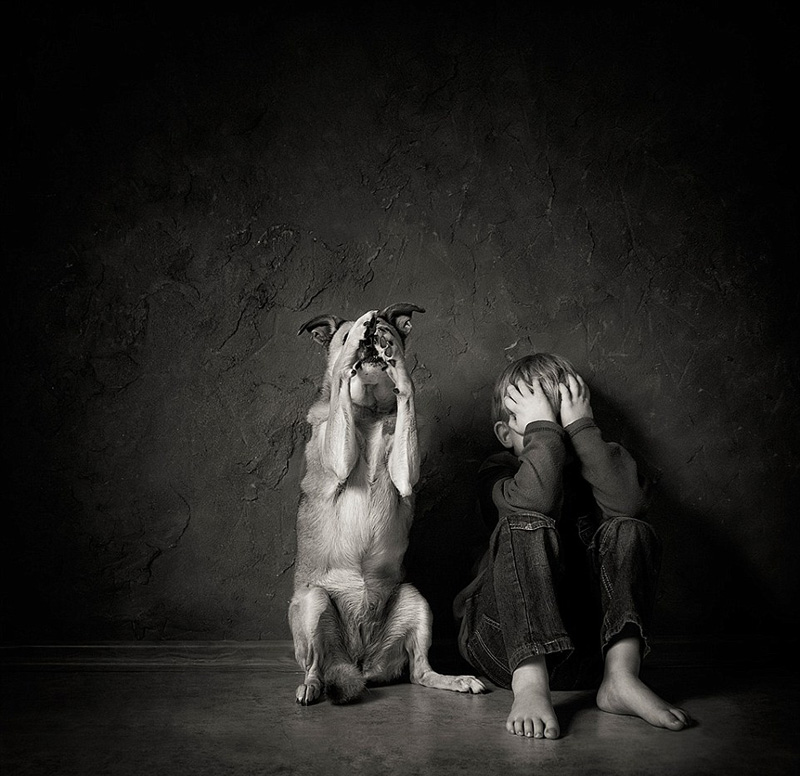 同时捂住眼睛的狗和小男孩。摄影:波兰卡兹克-克里兹。(网页截图)