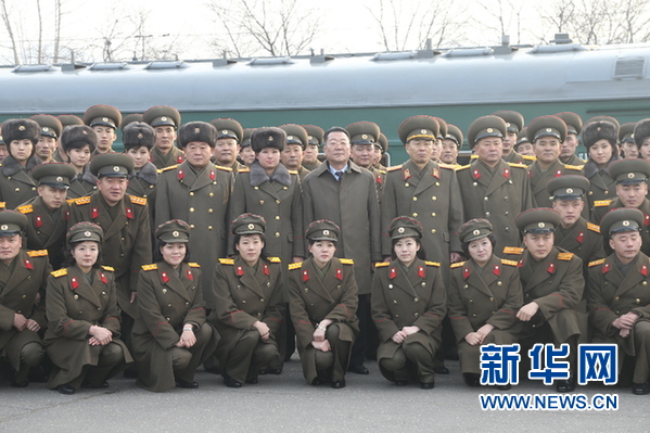12月9日,在朝鲜首都平壤,朝鲜功勋国家合唱团和牡丹峰乐团成员临行合影。由朝鲜劳动党中央宣传部第一副部长崔辉率领的朝鲜功勋国家合唱团和牡丹峰乐团9日从平壤乘专列启程访华演出。朝鲜劳动党中央书记金己男、中国驻朝鲜大使李进军等为访问团送行。 新华社记者 郭一娜 摄