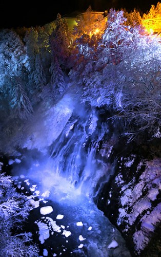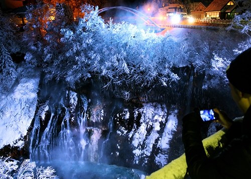 当天,这般雪景中映衬瀑布的梦幻景色,让前来参观的游客们沉醉其中。点灯活动将持续至2016年3月27日。