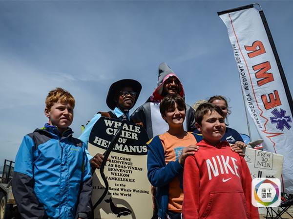 图为在赫曼纽斯,游客争相与“鲸鱼呼叫者”埃里克(左二)合影。