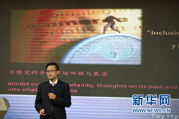 图为12月7日,富登小额贷款公司董事兼首席执行长郑汉聪在“现代物流与金融发展国际会议”上发表主题演讲 (袁泳/摄)
