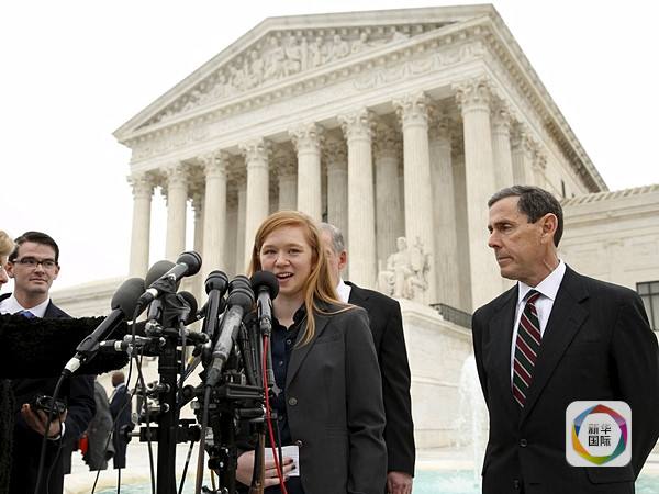 费希尔(中)与律师在最高法院外接受媒体记者采访。(图片来源:新华/路透)