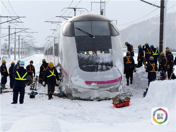 图为2013年3月3日,在日本秋田县大山,调查人员和铁路工作人员在脱轨的新干线列车列车旁查看。 (新华/法新)