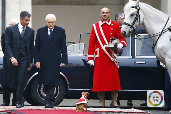 1月31日,在意大利举行的总统选举第四轮投票中,73岁的民主党推举的候选人、现任宪法法院法官塞尔焦·马塔雷拉当选新总统,接替此前因年龄原因辞职的纳波利塔诺。马塔雷拉曾任副总理、国防部长等职。意大利属议会共和制国家,总统并不具行政实权,但负责在议会选举后任命总理,以及在政府未通过议会信任投票时宣布解散议会并重新大选。图为马塔雷拉(左二)抵达总统府准备检阅仪仗队时,受到总统卫队的吉祥物小狗的迎接。