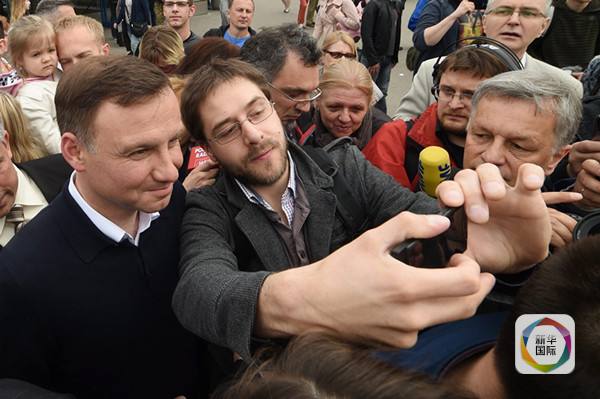 5月24日,波兰举行总统选举第二轮投票,43岁的波兰最大反对党法律与公正党候选人安杰伊·杜达获得51.55%的选票,战胜现任总统布罗尼斯瓦夫·科莫罗夫斯基,当选波兰新总统。杜达曾任司法部副部长、总统办公厅副国务秘书等职。图为安杰伊·杜达(左)与民众自拍。