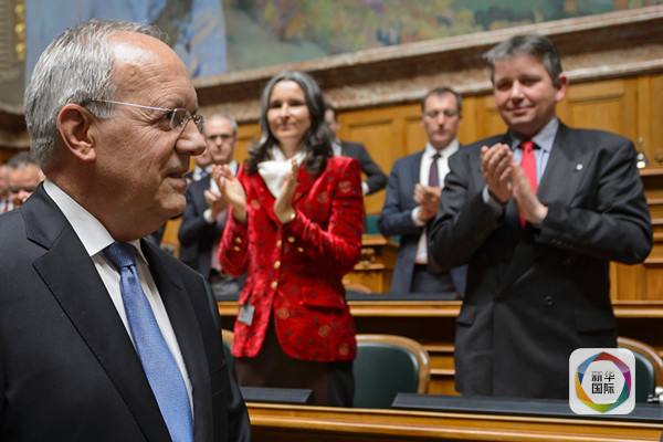 12月9日,在瑞士联邦议会两院联席会议举行的选举中,63岁的瑞士联邦副主席兼经济部长施奈德-阿曼获得208张有效选票中的196张,当选瑞士联邦新一任主席。图为施奈德-阿曼(左前)接受大家祝贺。(编辑顾德伟,新华国际客户端报道)