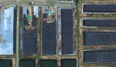 对核辐射土壤进行包装存放的黑塑料袋集中存放在海岸线一带。