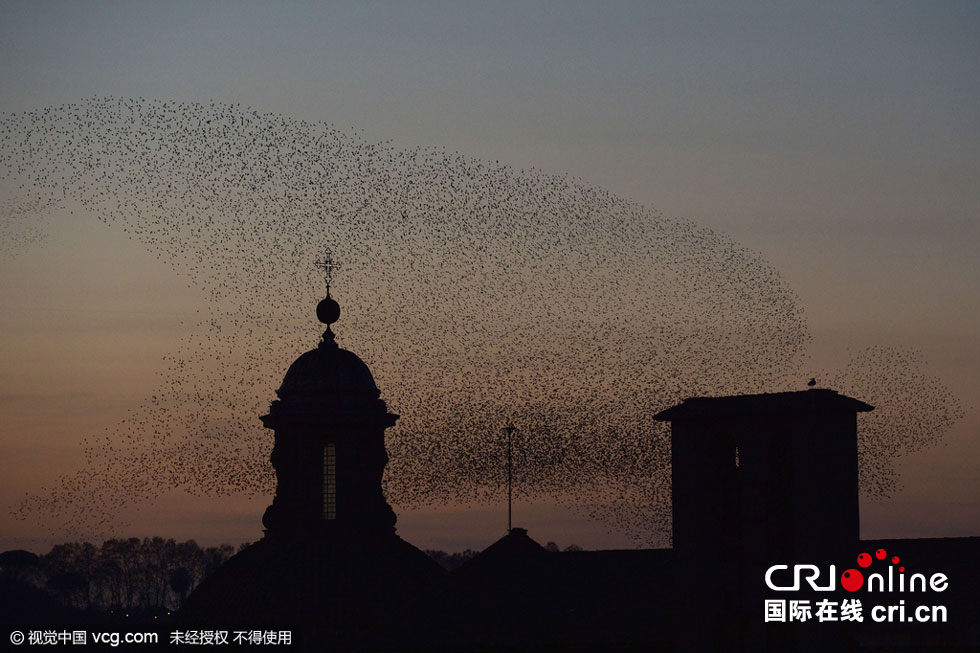 当地时间2015年12月12日,意大利罗马,百万椋鸟迁移在空中形成美丽形状。图片来源:TIZIANA FABI/视觉中国