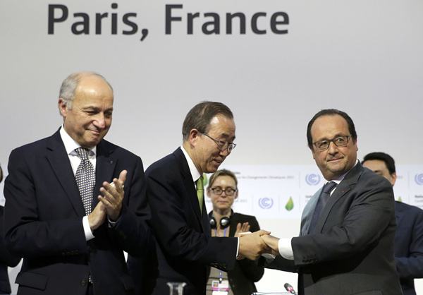 12月12日,在巴黎北部市郊的布尔歇展览中心,联合国秘书长潘基文与法国总统奥朗德握手,庆祝《巴黎协定》的达成。 (新华社/路透)