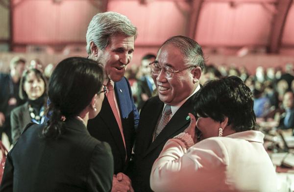 12月12日,在法国巴黎北郊的布尔歇展览中心,中国气候变化事务特别代表解振华出席巴黎气候变化大会时与美国国务卿克里交谈。(新华社记者周磊摄)