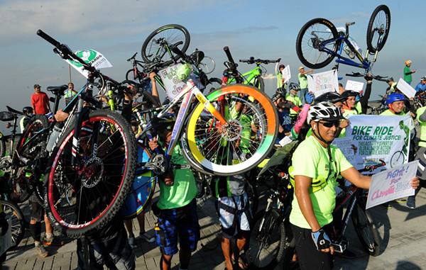 12月13日,在菲律宾,环保主义者参与自行车骑行活动,庆祝巴黎气候变化大会达成协定。(法新)