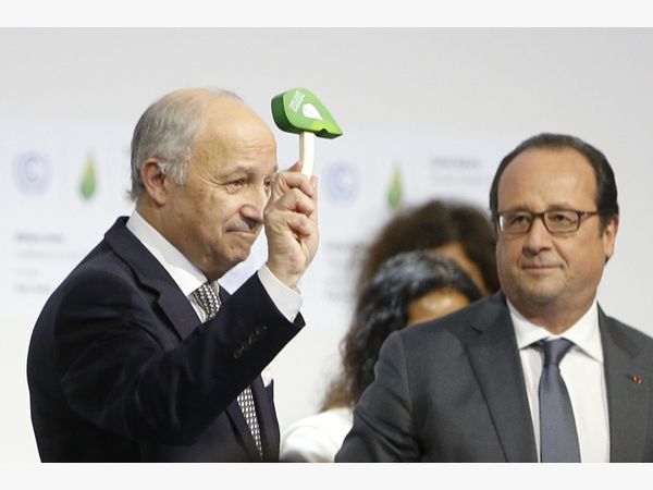 新华网北京12月14日电 巴黎时间12月12日晚19点26分,在延期超过24小时的巴黎气候变化大会最后一次全会上,大会主席、法国外长法比尤斯举起带有大会标志的绿色小锤,宣告里程碑式的《巴黎协定》诞生,全球应对气候变化进程迈出重要一步。