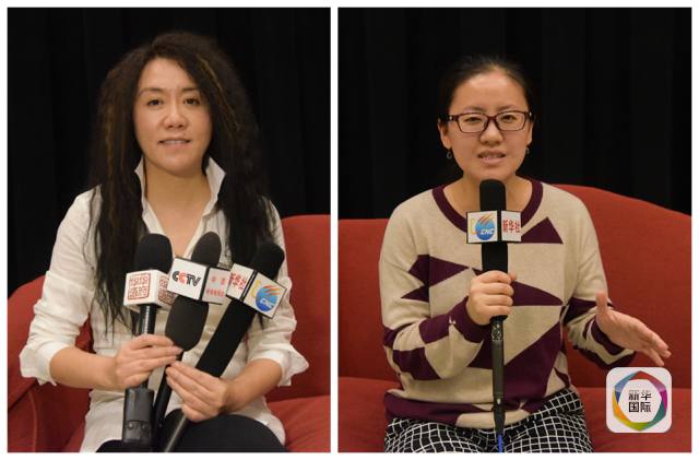 《又见国乐》导演王潮歌(左)和作曲/编曲姜莹接受媒体采访。
