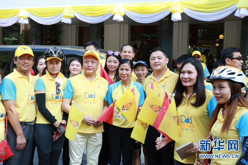 曼谷分为7组的骑行队伍中,有一支近70人的小组异军突起——统一标有“bike for dad”(为父骑行)字样的黄色新车,车头插上五星红旗和泰国王室黄旗,在相互间响亮的中文骑行指令下保持队形。这道泰国街头醒目的风景线所到之处,泰国人们及外国游客都为之欢呼雀跃,并纷纷掏出相机记录下骑行盛事中这绚丽一幕。