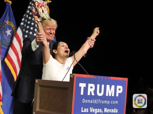2015年10月8日,特朗普在竞选活动中邀请35岁的米里娅姆·威彻上台。