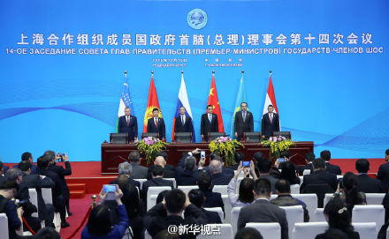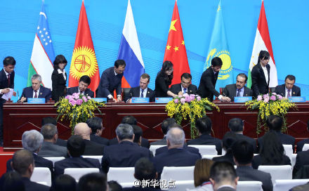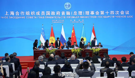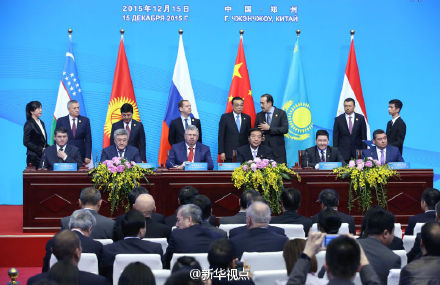 新华网北京12月15日电 15日上午,上合组织成员国领导人在郑州国际会展中心出席上合总理会后出席签字仪式。李克强总理同其他成员国领导人共同签署了《上海合作组织成员国政府首脑(总理)理事会第十四次会议联合公报》,发表了区域经济合作的声明,并见证了海关合作等文件签署。(新华视点微博)