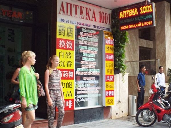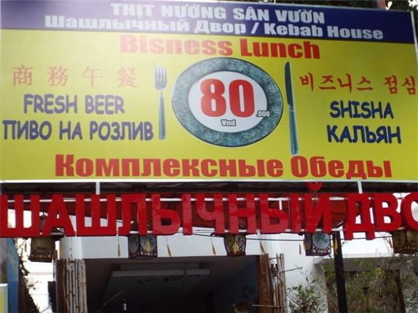 芽庄是越南中部的庆和省省会,以其迷人的海滨、海岛风光而闻名,是越南著名海滨旅游城市。新华国际客户端了解到,近年来,到芽庄旅游度假的外国游客逐年增多,其中又以来自中国和俄罗斯的游客最多,数量超过芽庄接待外国游客总数的60%。当地商家为了不失时机地招揽中俄两国游客,纷纷在店铺招牌、服务内容介绍以及菜单中添加中文和俄文内容,而且还将中俄文字体放大,超过越文以及英文等其他外文字体。漫步芽庄市内,大部分餐馆、旅游纪念品店、旅行社、美容按摩店等的招牌几乎都是中俄文大行其道,其次是日韩文。