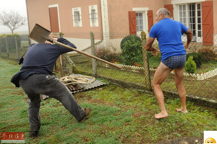 【敲打】11月9日,在法国南部城市欧东,一名房主用铲子砸中鸟类保护联盟成员。这位房主在房屋周围的土地上布满捕鸟陷阱,引发了这次矛盾。