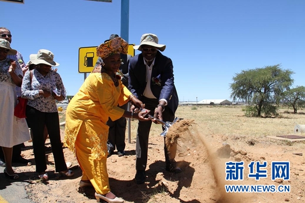 12月15日,纳米比亚工作和交通部长艾尔菲尔斯与首都所在的霍玛斯地区行政长官劳拉共同为机场高速路破土。新华网发 吴长伟摄