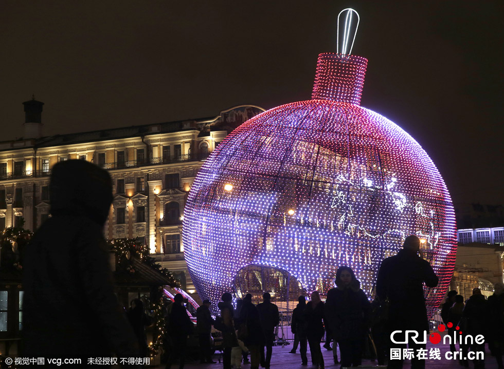 当地时间2015年12月15日,俄罗斯莫斯科,一个17米高的圣诞树装饰彩球造型灯饰亮相莫斯科Manege广场。该灯饰由LED小灯组成,预计将入选吉尼斯世界纪录。图片来源:视觉中国