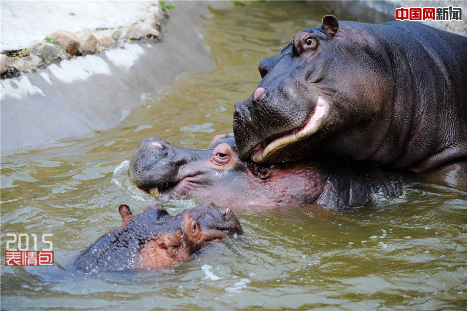 2015年4月28日,山东青岛森林野生动物世界河马馆,“晶晶”一直在干扰“亮亮”与母河马交配。(东方IC)