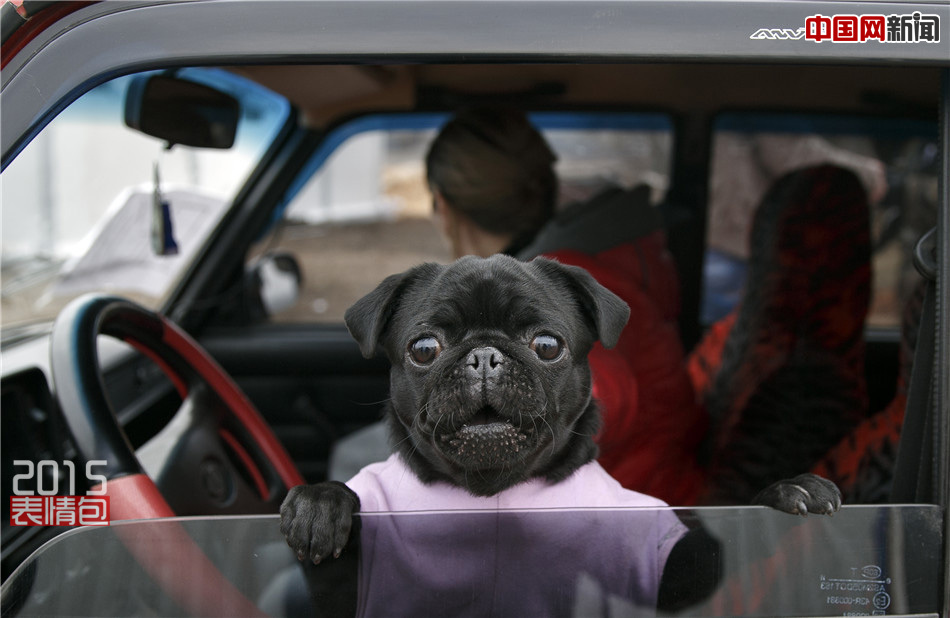 当地时间2015年3月3日,乌克兰Kurakhove,在一处通往亲俄叛军控制地区的军事检查点,一只狗狗趴在车窗前向外看。(东方IC)