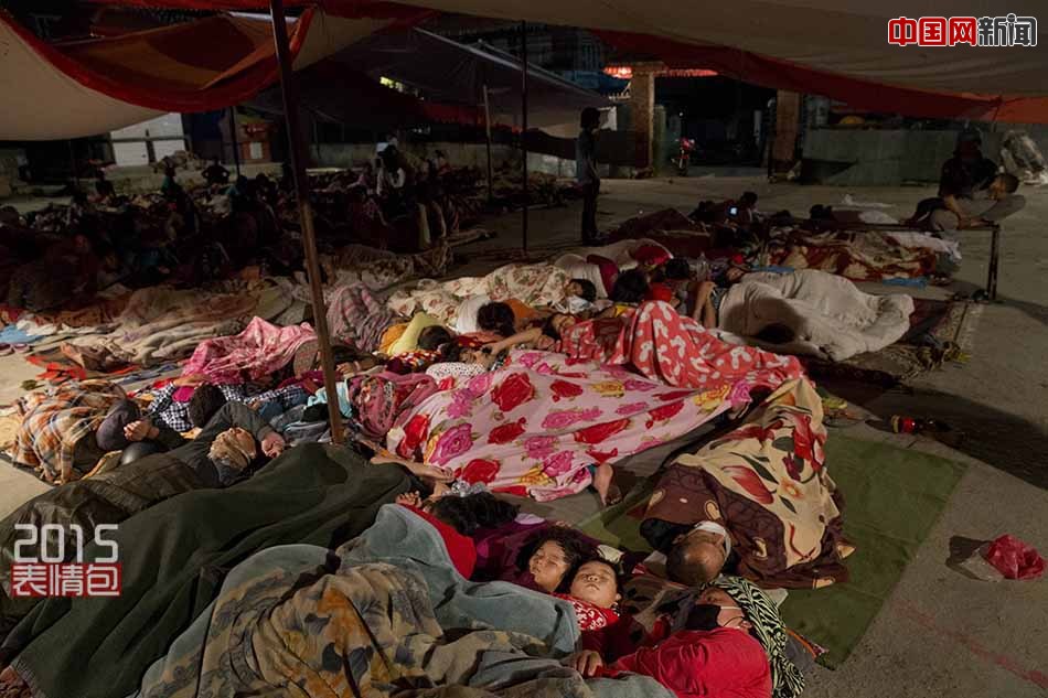 当地时间2015年5月12日,尼泊尔加德满都,地震发生后,民众露宿街头,睡在空地上。当天,尼泊尔再次发生7.5强烈地震,当地媒体报道的死亡人数已达47人。