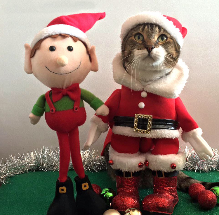 图片显示三只猫乔伊(Joey)、克莱奥(Cleo)和墨里森(Morrison)被装扮成节日精灵、圣诞老人、海盗和老人。而乔伊身着蓝色连体衣,手捧一盘饼干,惬意地躺在沙发上。珍妮佛说猫是从收容所里救出来的,她发现它们酷爱打扮,便经常为它们打扮。